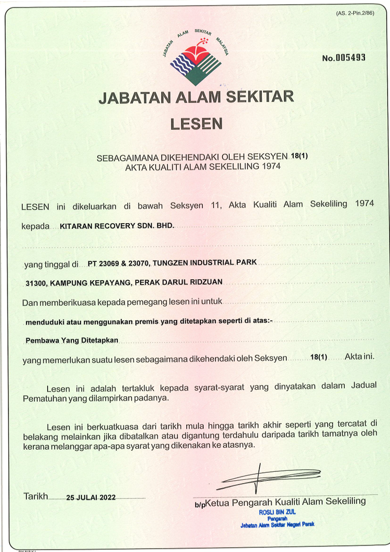 Kitaran Recovery Sdn. Bhd. is a recovery facility to recover various kinds of scheduled wastes generated by industry’s waste generators. In many parts of the world, poor management of scheduled wastes has led to environmental degradation and irreversible damage to the ecosystem. Thus, it began to dawn upon that industrialization must progress hand-in-hand with protection of environment.