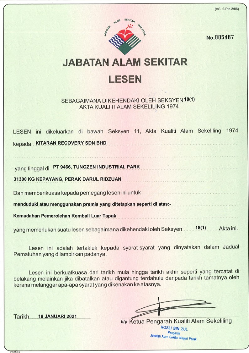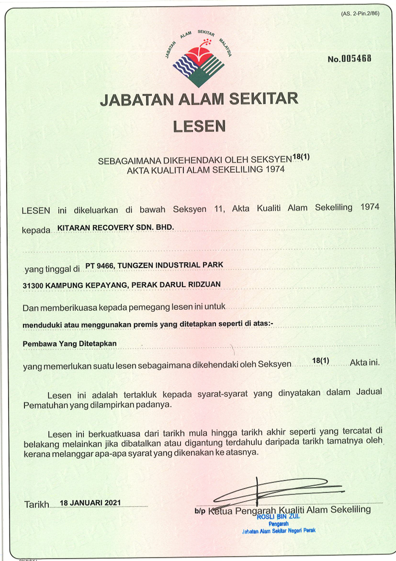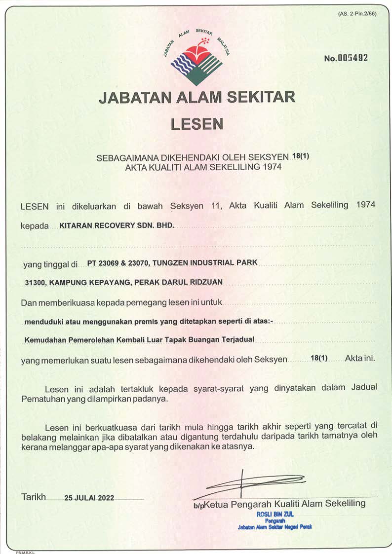 Blistering of industrialization growth due with extends of comprehensive scheduled wastes in Malaysia has prompted the Kitaran Recovery Sdn. Bhd. to expand the business through the scheduled waste recovery facility. It was formed in year 2007, where it sees the importance of waste management as the contaminated waste was unintentially dumped in landfill or burned indiscriminately at obscure places.